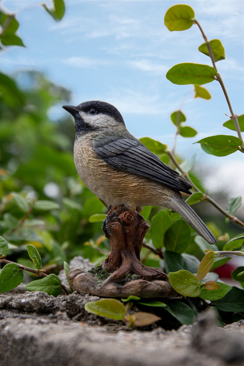 A colorful Chickadee peeking on the stump statue is a treat to watch.