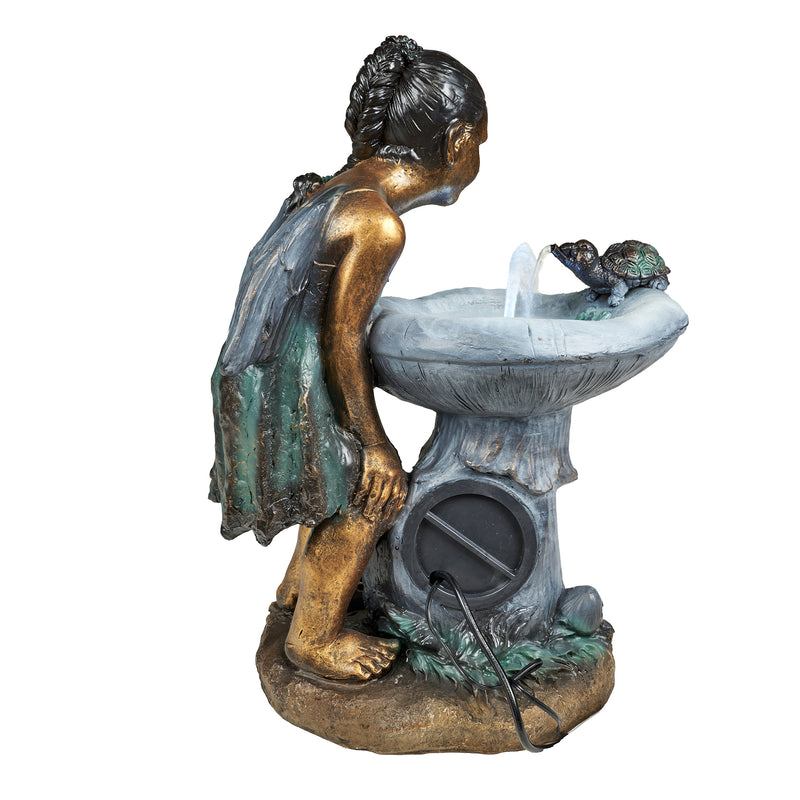 Featuring a little girl standing by a fountain while watching her little turtle friend, this serene childhood moment appears to be frozen in time and has a bronze finish. This fountain, which features one warm-white LED, is sure to fit into any garden or setting.