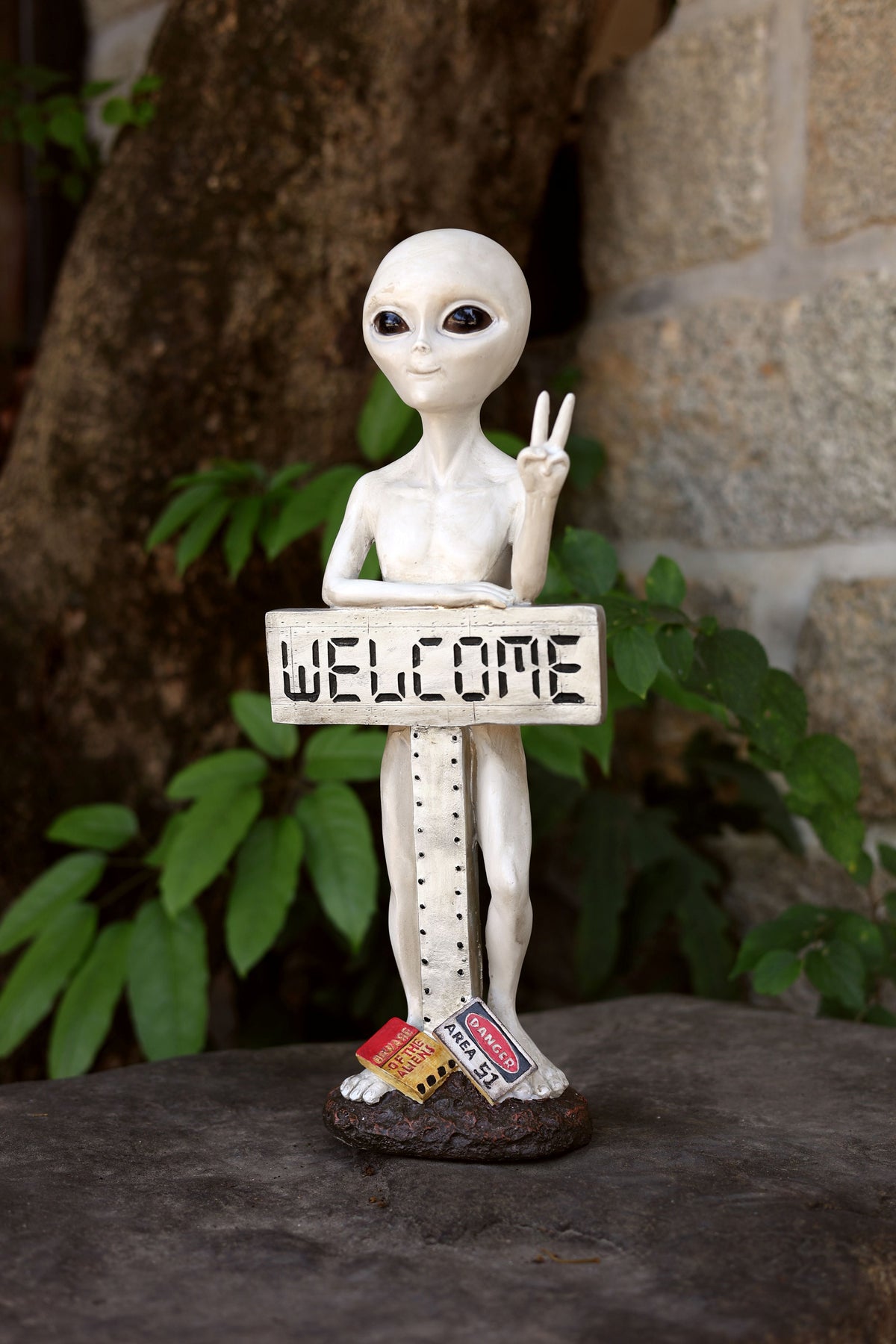 Bring a touch of the extraterrestrial to your home or garden with this quirky Alien Resin Statue with Welcome Sign. Crafted from durable, weather-resistant polyresin, this charming alien figure offers a warm, otherworldly greeting to guests wherever you place it—indoors or outdoors. Its smooth surface makes it easy to clean, and its playful design makes it a great conversation starter or a fun gift for sci-fi lovers.