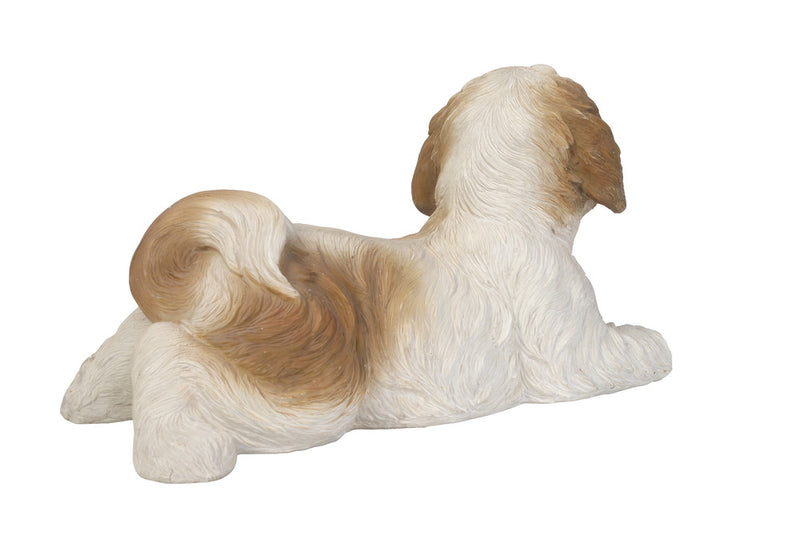 Adorable brown and white shih tzu stretched out in a laying down position. Gazing up with life like dark eyes, its mouth is slightly open showing a soft pink tongue. Made from polyresin it is perfect for both indoor and outdoor display. Makes a great gift for dog lovers. Height: 7.5" Length: 14.5" Item Composition: Poly-resin COLOUR: Tan/White