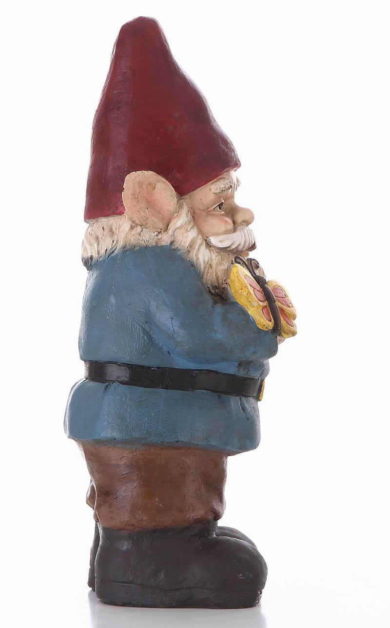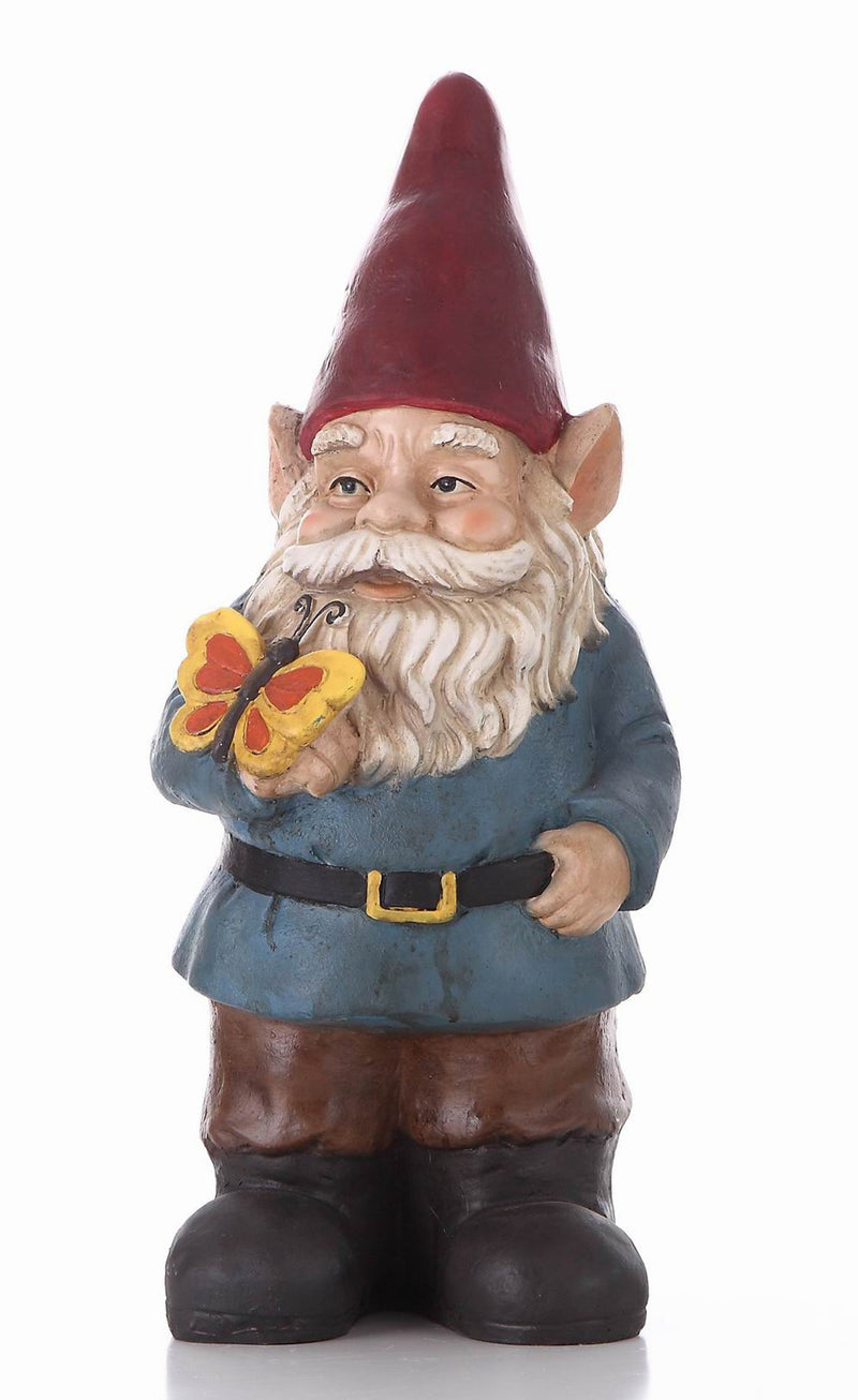 Add a little gnome fun to your entryway, garden or flowerbed. with a pointy elf hat atop his bobblehead, imaginatively sculpted, this gnome statue is made of poly-resin and is good for both indoor and out. Wears brown trowsers, a blue shirt, belt, black boots, and the traditional red pointed cap.