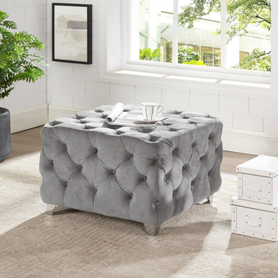 Made of lush velvet and finished with shiny silver stainless steel legs, this tufted rectangle ottoman will add a hint of finesse to any space. This Grey and Silver ottman, upholstered in a rich grey velvet, is detailed with a button-tufted finish across the piece, which is further accessorized with silver finishing at its feet, adding charm to the entire piece.