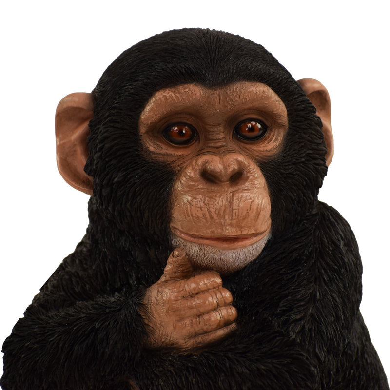 Baby Monkey sitting thoughtfully with knees curled up under folded arms. Beautiful dark coat with light features around the face, hands, feet, and ears. Finished with natural brown eyes. Made with polyresin.