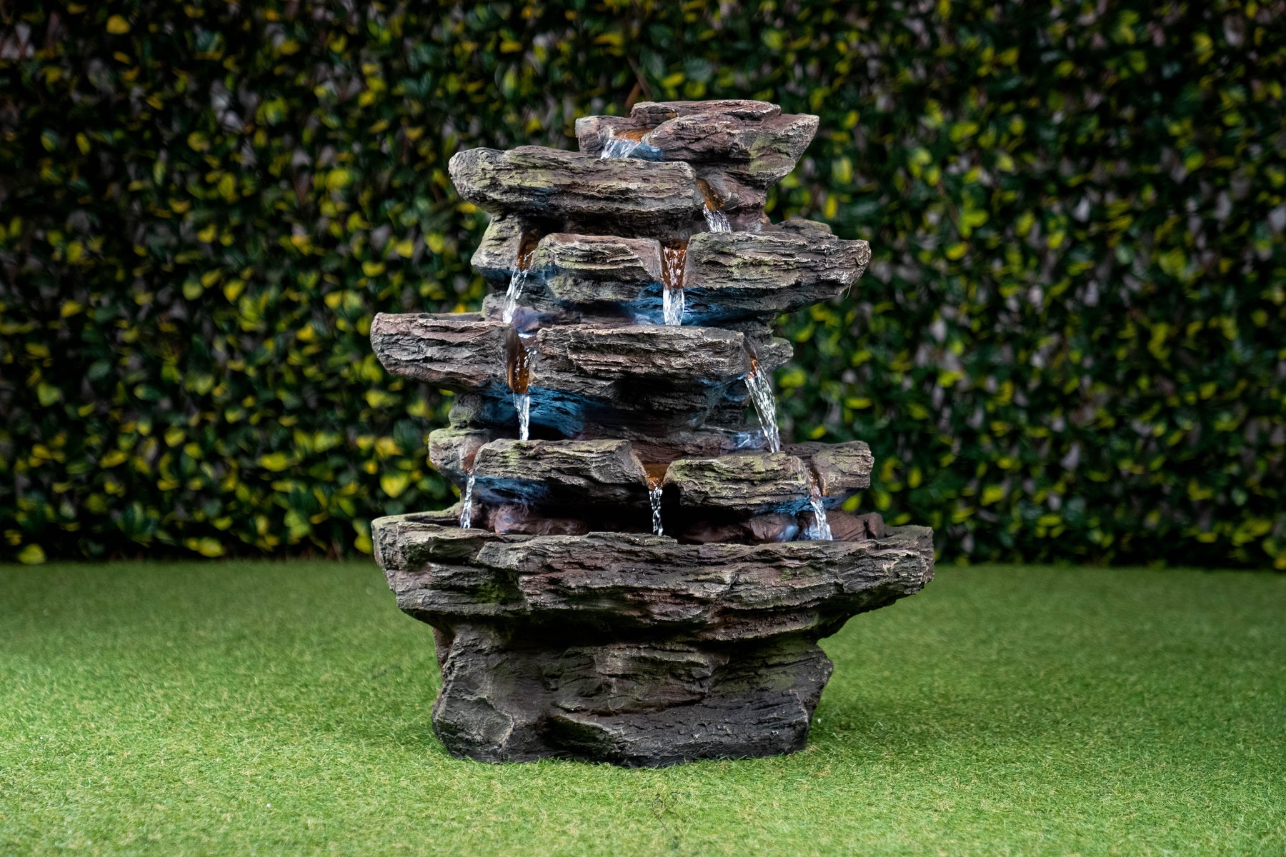 Spruce up your garden or yard with this amazing water fountain. Capture the calming sound of water is it cascades from one level to the next. Appears to be multi levels of stone with water gently flowing. The light feature will add warmth and creavitity to the ambience especially at night. A delightful addition to any decor. Indoor/Outdoor use.