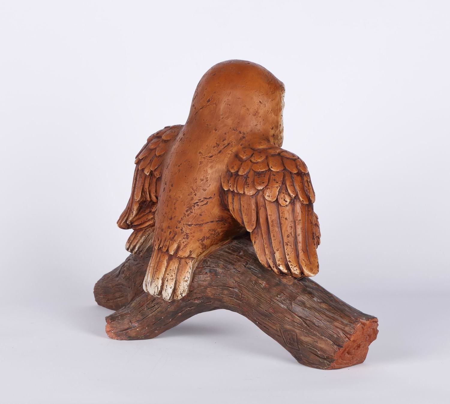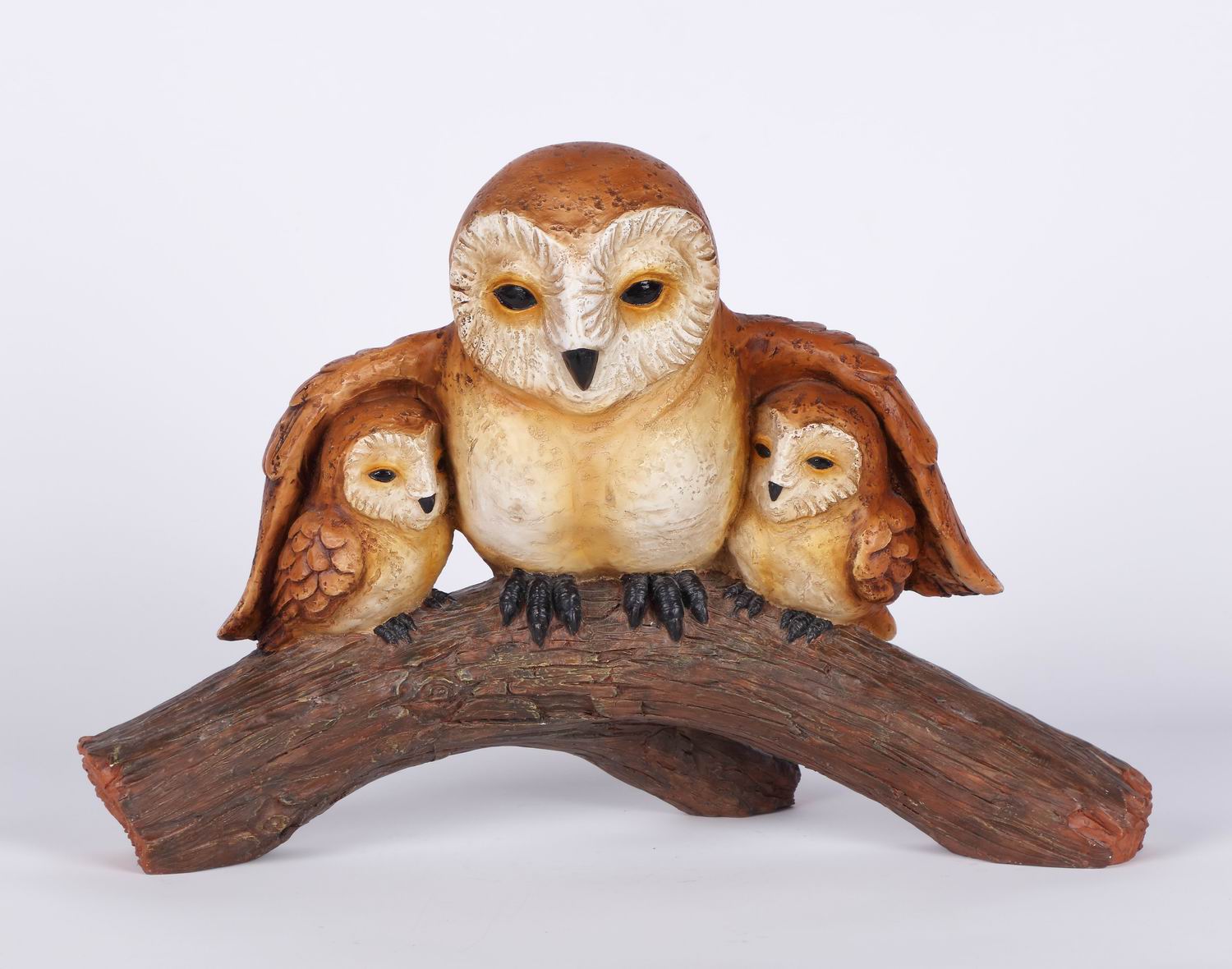 A adorable owl family garden statue. The mother owl is providing protection for her young as they rest on a tree branch. A great addition to your garden decor.